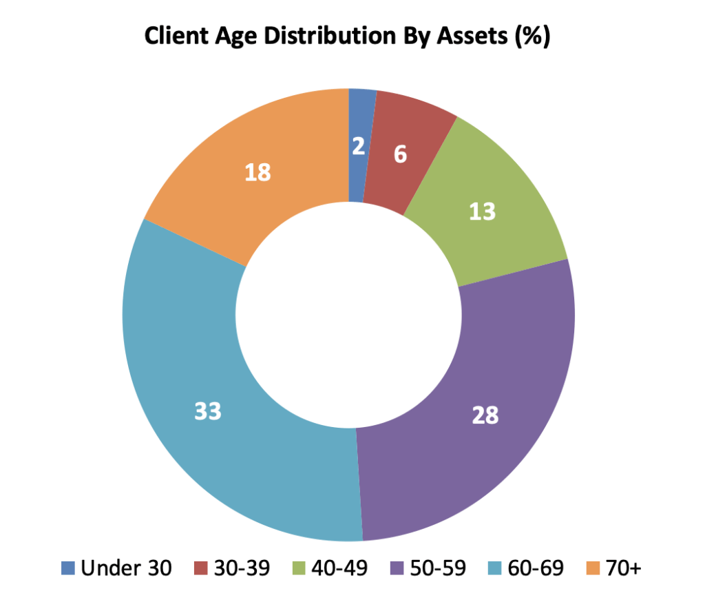 The bulk of wealth naturally concentrates in the 50 to 69 age range, where careers peak, compounding has had decades to work, and the focus shifts from building to protecting. Beyond that, many clients in their 70s and above continue to steward significant assets with a mindset of preservation and legacy.